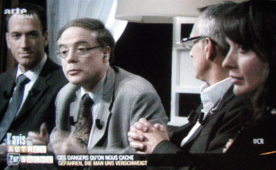 "EDF exportiert keinen radioaktiven Abfall, weder nach Rußland noch woanders hin", versicherte der Leiter der Abteilung Kernbrennstoffe bei der EDF, Sylvain Granger (Mitte), in der "Arte"-Sendung am 13. Oktober. Für die "Libération"-Journalistin Laure Noualhat (rechts) war dies aber nur ein weiterer Versuch, faktischen Atommüll als "Wertstoff" zu tarnen.