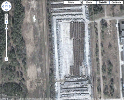 Die Behälter mit doppelt abgereichertem Uranhexafluorid werden in Tomsk-7 auf einer Art Parkplatz im Freien gelagert (Google-Satellitenbild)