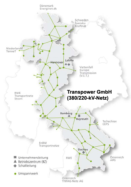Das ehemalige E.ON-Höchstspannungsnetz (380/220 kV) mit einer Stromkreislänge von 10700 Kilometern wurde in die Transpower GmbH ausgegliedert und jetzt an den niederländischen Netzbetreiber TenneT verkauft, mit dessen Netz es sich im Nordwesten berührt. |