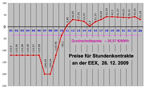 In der vortägigen Spotmarkt-Auktion am 25. Dezember 2009 sank der Preis für Stundenkontrakte am zweiten Weihnachtsfeiertag auf bis zu minus 199,99 Euro pro Megawattstunde. In den insgesamt zehn Stunden, in denen der Strompreis unter die Grenze von null Euro in den negativen Bereich abstürzte, belief sich die zusätzlich erforderliche Prämie für die Abnahme verschenkten Stroms auf 22.227.088 Euro. Auch über alle 24 Stunden des Tages hinweg ergab sich bei einem Handelsvolumen von insgesamt 430.270 Megawattstunden ein Verlust von 15.543.140 Euro. Der Durchschnittspreis pro Megawattstunde lag im Tagesmittel bei minus 35,57 Euro (siehe Tabelle).