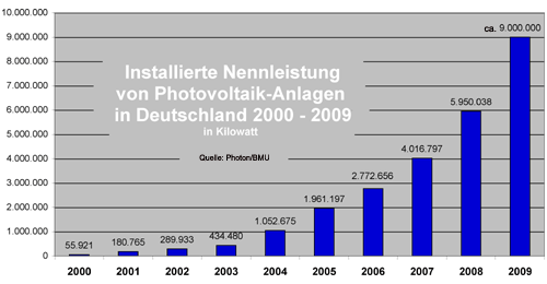 In den beiden letzten Jahren hat sich in Deutschland die installierte Nennleistung der Photovoltaik-Anlagen mehr als verdoppelt. Der von 2008 bis 2009 erzielte Rekordzuwachs von 3.000.000 Kilowatt soll in den kommenden Jahren als Richtschnur gelten. Bei deutlicher Über- oder Unterschreitung dieser Zielmarke wird die Solarförderung gesenkt bzw. erhöht. |