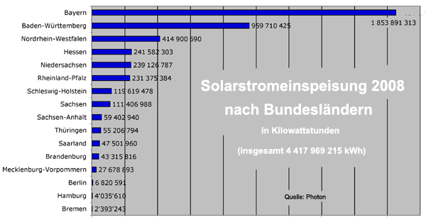 Diese Grafik zeigt, daß zwei Drittel der Solarstromeinspeisung in Deutschland auf die beiden Bundesländer Bayern und Baden-Württemberg entfallen. Natürlich müssen bei einem Vergleich die Unterschiede hinsichtlich Sonnenscheindauer, Bevölkerungszahl, Hausbesitz, Pro-Kopf-Einkommen und andere Faktoren berücksichtigt werden. So erklärt es sich auch, daß die ostdeutschen Länder bei der Solarstrom-Einspeisung ganz am Schluß marschieren, obwohl sich dort das Zentrum der deutschen Solarzellen-Herstellung befindet. Die insgesamt 4,4 Terawattstunden (TWh), die 2008 in allen Bundesländern zusammen eingespeist wurden, entsprachen etwa 0,72 Prozent des deutschen Bruttostromverbrauchs von ca. 615 TWh. Inzwischen wurde die Ein-Prozent-Marke überwunden. Wenn der Zuwachs im bisherigen Rekordtempo weitergeht, dürfte bis 2012 ein Anteil von zwei Prozent erreicht sein. |