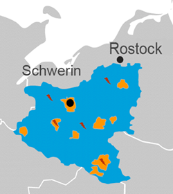 Die Wemag ist ein ländlich geprägter Verteiler mit fünf Netzdienststellen (rot). Schwerin und andere größere Kommunen (gelb) in ihrem Netzgebiet (blau) verfügen über eigene Stadtwerke. |