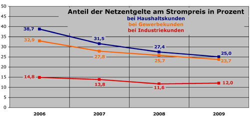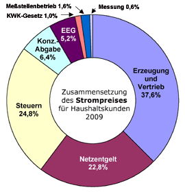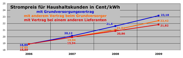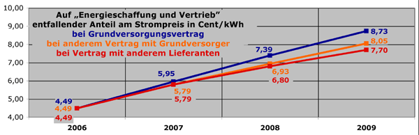 Vom 1. April 2006 bis zum 1. April 2009 erhöhte sich in der Grundversorgung für einen Haushaltskunden mit einem Jahresverbrauch von 3500 kWh der Preis pro Kilowattstunde um durchschnittlich 4,3 Cent oder 150 Euro im Jahr. Davon entfielen 1,1 Cent/kWh auf Strom- und Mehrwertsteuer, die proportional mit der Stromrechnung zunehmen (wobei die Mehrwertsteuer zusätzlich auf die Stromsteuer erhoben wird). Eine echte Kostenmehrbelastung registrierte die Bundesnetzagentur nur bei den sonstigen staatlich veranlaßten Preisbestandteilen (Konzessionsabgabe, EEG- und KWKG-Umlage). Diese betrug aber lediglich 0,4 Cent/kWh. Im übrigen basierte der Strompreisanstieg allein auf dem Preisbestandteil "Energiebeschaffung und Vertrieb", der sich um 4,2 Cent/kWh erhöhte.