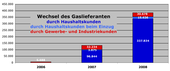 Für das Jahr 2007 verzeichnete die Bundesnetzagentur erstmals auch eine größere Anzahl Haushaltskunden, die den Gaslieferanten wechselten. Im Jahr darauf hatte sich deren Anzahl mehr als verdreifacht. Zum Teil erfolgte der Lieferantenwechsel beim Einzug in neue Räumlichkeiten. |