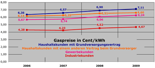 Beim Vergleich mit anderen europäischen Ländern bewegen sich die in Deutschland zu zahlenden Gaspreise im oberen Drittel (siehe Grafik 2). Der Jahresbericht der Bundesnetzagentur beziffert den mengengewichteten Mittelwert des Gaspreises für Haushaltskunden mit einem Grundversorgungsvertrag für das Jahr 2009 mit 7,11 Cent pro Kilowattstunde, was den vom Statistischen Bundesamt bzw. Eurostat genannten Mittelwert von 6,47 Cent/kWh noch übertrifft. Etwas billiger wurde es zwar, wenn die Kunden einen anderen Vertrag mit dem Grundversorger hatten. Aber auch dann zahlten sie noch 6,6 Cent/kWh (siehe Grafik 1.