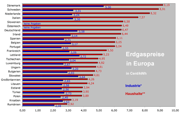 Haushaltskunden bezahlen in Deutschland für Erdgas mehr als in 18 anderen europäischen Ländern. Die Preise für die Industrie werden nur noch in Dänemark, Großbritannien und Tschechien übertroffen.