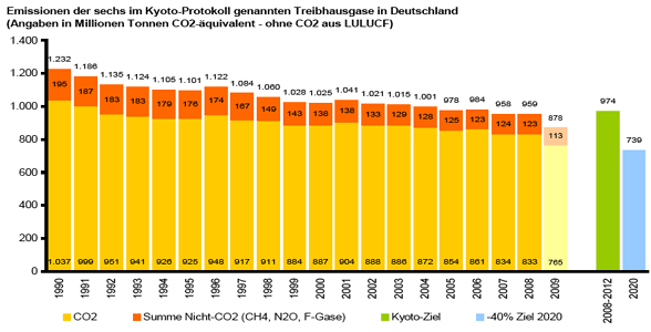 Die anhaltende Wirtschaftskrise hat zum stärksten Emissionsrückgang seit Gründung der Bundesrepublik Deutschland geführt. Der Gesamtausstoß aller Treibhausgase ist nach ersten Berechnungen des Umweltbundesamtes (UBA) im Jahr 2009 gegenüber 2008 um etwa 80 Millionen Tonnen gesunken (minus 8,4 Prozent). Gegenüber 1990 verringerten sich die Treibhausgas-Emissionen bis Ende 2009 um 28,7 Prozent. In der 2002 vereinbarten EU-Lastenteilung (020302) auf Grundlage des Protokolls von Kyoto (971215) hat sich Deutschland verpflichtet, seine Treibhausgas-Emissionen im Zeitraum zwischen 2008 und 2012 um 21 Prozent auf 974 Millionen Tonnen zu senken. Diese Zielmarke war bereits in 2008 unterboten worden (090302) und .