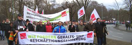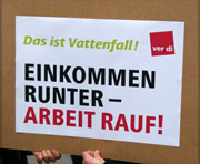 Am 4. März protestierten rund 3000 Vattenfall-Beschäftigte in Berlin gegen den geplanten Stellenabbau und andere Sparmaßnahmen zu Lasten der Belegschaft. Da Vattenfall Europe die Tochter eines schwedischen Staatsunternehmens ist, endete der Demonstrationszug vor der schwedischen Botschaft. Pressefotos Verdi |