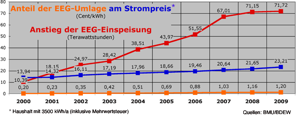 Seit 1. Januar 2010 ist für jede von Letztverbrauchern bezogene Kilowattstunde eine EEG-Umlage von 2,047 Cent zu entrichten. Das entspricht einer Steigerung um 70 Prozent gegenüber den 1,2 Cent/kWh, die im letzten Jahr gemäß § 53 EEG als "Differenzkosten" für die EEG-Förderung auf der Stromrechnung ausgewiesen werden durften. Der Bundesverband der Energie- und Wasserwirtschaft (BDEW) sprach am 1. April pauschal von "Mehrkosten durch Ökostrom", die 2010 auf 8,2 Milliarden Euro steigen würden, gegenüber 4,9 Milliarden Euro im Vorjahr. Anscheinend will die Branche den Anschein erwecken, als ob die Kosten der EEG-Förderung enorm gestiegen seien. Im wesentlichen wurden aber nur frühere Bestandteile der Netzkosten in die EEG-Umlage umgeschichtet. Der Grund dafür ist die Verordnung zur Neuregelung des EEG-Ausgleichsverfahrens (AusglMechV), die auf Basis von § 64 EEG mit Zustimmung des Bundestags erlassen wurde und zum 1. Januar 2010 das alte Verfahren ablöste.