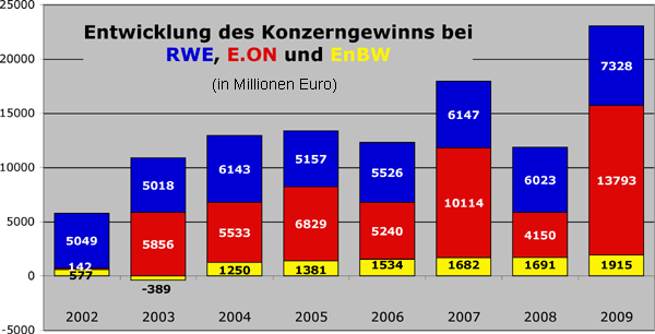 Die drei Energiekonzerne E.ON, RWE und EnBW haben ihre jährlichen Gewinne von 2002 bis 2009 um das vierfache gesteigert und insgesamtüber 100 Milliarden Euro erzielt. Für das Jahr 2010 bahnt sich ein weiterer Rekordgewinn an. Zu dieser Feststellung gelangt eine Kurzstudie, die Uwe Leprich und Andy Junker von der Hochschule für Wirtschaft und Technik des Saarlands im Auftrag der Bundestagsfraktion der Grünen erstellt haben. Die Studie wurde am 20. Oktober auf der Internetseite der stellvertretenden Fraktionsvorsitzenden der Grünen im Bundestag, Bärbel Höhn, veröffentlicht.