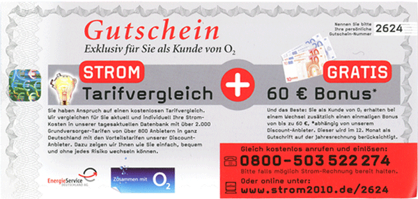 Die RWE-Stromvertriebstochter "eprimo" bedient sich weiterhin des Direktmarketing-Unternehmens "Energie Service Deutschland AG" (ESD), um mit dubiosen Methoden neue Kunden zu gewinnen. Zu den Geschäftspraktiken gehört neuerdings, daß Kunden des Mobilfunkanbieters O2 einen "Gutschein" für einen "kostenlosen Tarifvergleich" erhalten. Zusätzlich wird ein einmaliger Bonus versprochen, falls der Wechsel zu einem "Discount-Anbieter" erfolgt.