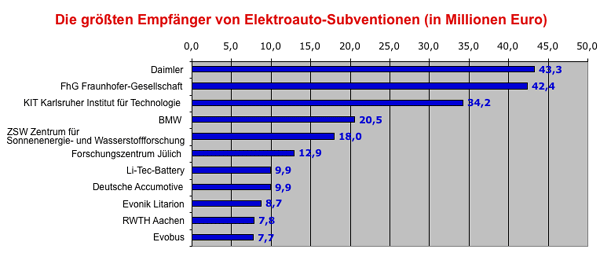 Falls es der kleinen mittelständischen Firma tatsächlich gelungen sein sollte, dem Elektroauto zu Reichweiten bis 600 Kilometer zu verhelfen, wäre dies ein entscheidender Fortschritt. Zugleich würde damit die Forderung der deutschen Industrie nach Milliarden an Subventionen zur Förderung der Elektromobilität noch fragwürdiger, als sie es ohnehin schon ist. Die neu gegründete "Nationale Plattform Elektromobilität" (100505) hat im November 2010 einen Zwischenbericht vorgelegt, in dem sie den Förderungsbedarf allein bis zum Jahr 2013 auf rund vier Milliarden Euro veranschlagt. Die schon jetzt mit Subventionen von 500 Millionen Euro verwöhnte Industrie- und Forschungslobby (siehe Grafik) erwartet offenbar, daß der Staat zumindest die Hälfte dieser Summe übernimmt. Der Großteil des Geldes soll dabei in technisch unproblematische Bereiche wie Antriebstechnologie und Ladeinfrastruktur fließen, obwohl das einzige wirkliche Hindernis für die Einführung des Elektroautos die unzureichenden Batterieleistungen sind (siehe Hintergrund).