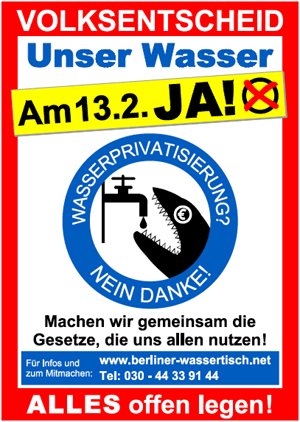 Die Bürger Berlins erzwangen am 13. Februar mit einem Volksentscheid die komplette Offenlegung der Verträge, mit denen 1999 die Privatisierung der Berliner Wasserversorgung erfolgte (990624). Die damals in Berlin herrschende Große Koalition aus CDU und SPD hatte 49,9 Prozent der Berliner Wasserbetriebe (BWB) an RWE und Vivendi (heute Veolia) verkauft, wobei den beiden Konzernen in geheimen Abmachungen erheblich größere Profite zugesichert wurden, als ihnen anteilsmäßig zugestanden hätte. Federführend war dabei die damalige Finanzsenatorin Annette Fugmann-Heesing (SPD), die auch die Privatisierung des Berliner Stromversorgers Bewag (970501) und des Schwesterunternehmens Gasag (980209) in die Wege geleitet hat. Ruchbar wurde der Handel erst, als nach Ablauf einer bis 2003 vereinbarten Karenzzeit die Berliner Wasserpreise fast doppelt so stark wie im Bundesdurchschnitt stiegen. Das breite Aktionsbündnis "Berliner Wassertisch" betrieb seitdem die Offenlegung die Verträge. Die oppositionellen Grünen nutzten zudem die Empörung über das dubiose Geschäft, um die aktuell regierende Koalition aus SPD und Linke in Bedrängnis zu bringen, die mit bemerkenswertem Ungeschick auf die Enthüllungen reagierte und so den Anschein einer fortdauernden Komplizenschaft mit RWE und Veolia erweckte (100713).