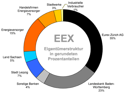 Die Eurex war bereits die treibende Kraft bei der Gründung der Frankfurter Strombörse EEX (000119) und mit 48 Prozent deren tonangebender Aktionär. Als die Frankfurter EEX mit der Leipziger Strombörse LPX fusionierte, erhielt sie im Austausch eine 23-prozentige Beteiligung an der neuen EEX mit Sitz in Leipzig. Zweitgrößte Aktionäre waren mit jeweils 17 Prozent die skandinavische Strombörse Nordpool und die Sachsen LB (060710). Beim Rückzug von Nordpool aus der EEX sah Eurex die Gelegenheit, den eigenen Anteil auf 44 Prozent zu erhöhen (080208). Es blieb dann aber bei 35 Prozent. Etwa zur selben Zeit versank die Sachsen LB im Sumpf einer Finanzaffäre und mußte von der Landesbank Baden-Württemberg (LBBW) gerettet werden. So wurde die LBBW zweitgrößter Aktionär der EEX. Erst in weitem Abstand folgten Leipzig und das Land Sachsen mit zusammen etwa elf Prozent (siehe Grafik). Die übrigen vierzig Aktionäre der EEX verfügen über mehr oder weniger symbolische Beteiligungen. In 32 Fällen beträgt der Anteil sogar unter ein Prozent.