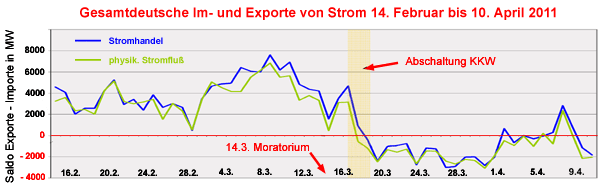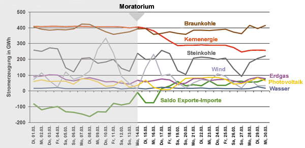 Die deutschen Energiekonzerne konnten die Stromlücke, die durch die Abschaltung der fünf Kernkraftwerke entstand, durch vermehrte Importe aus den angrenzenden Ländern ausgleichen. Das kam für sie billiger, als wenn sie die durchaus noch vorhandenen Kraftwerksreserven im eigenen Land aktiviert hätten. Der übliche Exportüberschuß der deutschen Stromwirtschaft wurde deshalb nach dem Abschalten der fünf Kernkraftwerke zu einem Importüberschuß. Vor allem im Handel mit Frankreich, Tschechien und Dänemark war ein deutliche Veränderung der Export-Import-Relationen zu beobachten.