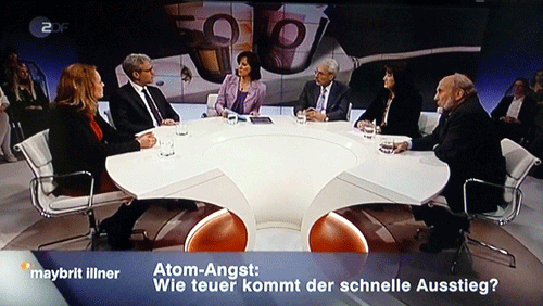 Auch in der Fernseh-Talkshow vom Maybrit Illner am 14. April bekundete BDEW-Chefin Hildegard Müller (zweite von rechts) größere Gemeinsamkeiten mit Bundesumweltminister Norbert Röttgen (zweiter von links) als mit den neben ihr sitzenden Kernenergie-Verfechtern Fritz Vahrenholt (RWE) und Hans-Werner Sinn (Ifo-Institut). Links die Bundesgeschäftsführerin der Linken, Caren Lay. |