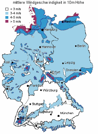Ergiebige Windstärken wie in in den küstennahen Gebieten der norddeutschen Tiefebene gibt es in Baden-Württemberg nur an wenigen Stellen im Schwarzwald und auf der Alb. Diese Karte veranschaulicht die mittleren Windgeschwindigkeiten in 10 Meter Höhe. Moderne WKA erreichen eine Nabenhöhe von rund hundert Metern, wodurch auch die Ergiebigkeit zunimmt. Dafür sind sie dann um so auffälliger im Landschaftsbild. Grafik: Hamburger Bildungsserver