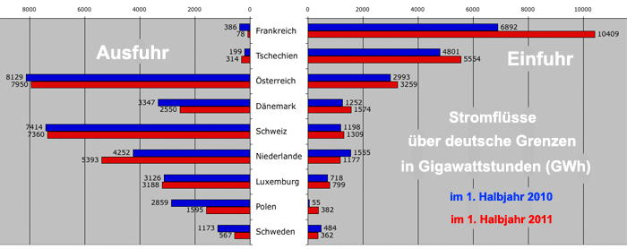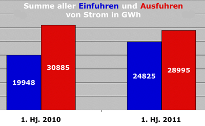 Der BDEW verwies vorsorglich darauf, daß es sich bei den grenzüberschreitenden Stromflüssen zum großen Teil nicht um vertraglich vereinbarte Ex- und Importe, sondern um Transitmengen und Ringflüsse handele. Dennoch ist die Verringerung des Ausfuhrüberschusses insgesamt sicher auf die vermehrten Importe zurückzuführen, mit denen die KKW-Erzeugungslücke ausgeglichen wird. Besonders stark war die Zunahme mit 3517 Gigawattstunden (GWh) bei den Stromflüssen aus Frankreich. Das sind 51 Prozent mehr als im ersten Halbjahr 2010. Deutlich zugenommen haben auch die grenzüberschreitenden Stromflüsse aus Tschechien (+ 15,7%) und Dänemark (+ 25,7%). Die Einfuhren aus Polen haben sich sogar annähernd versechsfacht, was in absoluten Zahlen allerdings nur einer Zunahme um 327 GWh und damit etwa dem Plus aus Dänemark entspricht.
