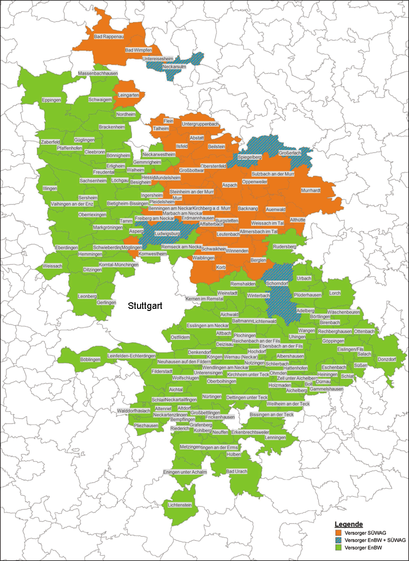 Die Stromnetze der 176 Mitglieder des Neckar-Elektrizitätsverbands (NEV) werden bisher von der EnBW (grün), der Süwag (braun) oder beiden Unternehmen (blau) betrieben. Das Verbandsgebiet erstreckt sich nördlich, südlich und östlich um Stuttgart. Die Landeshauptstadt gehört nicht zum NEV, plant aber ebenfalls die Rekommunalisierung ihrer Stromversorgung. Grafik: NEV