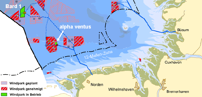 In der deutschen Nordsee sind bisher nur zwei Offshore-Anbindungen in Betrieb: Die eine führt zum Testfeld "alpha ventus" und die andere zum teilweise vollendeten Windpark "Bard 1". Bereits genehmigt sind 24 weitere Windparks. Bei ihnen werden sich Baubeginn und Inbetriebnahme zum Teil erheblich verzögern, weil Tennet als allein zuständiger Transportnetzbetreiber für die Nordseeküste mit den Netzanschlüssen nicht nachkommt (siehe auch Karte aller Windpark-Projekte in der deutschen Nordsee sowie Tabelle mit bisher erteilten Genehmigungen). |