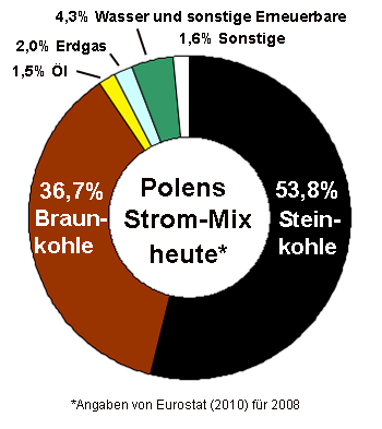 Der Bau von eigenen Kernkraftwerken wird mit der notwendigen Auffächerung des polnischen Strom-Mixes begründet, der bisher zu über neunzig Prozent auf Kohle gründet (siehe Grafik). In der ersten und zweiten Periode des Emissionshandels wurden die polnischen Stromerzeuger zwar reichlich mit Gratis-Zertifikaten versorgt (090903). Das könnte sich aber ändern und wegen der Kohle-Lastigkeit der der polnischen Stromerzeugung zu einer spürbaren Belastung werden.