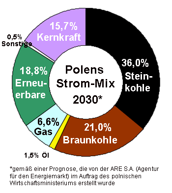 Vorerst wird Polen seinen Strom aber weiterhin zu über neunzig Prozent aus Steinkohle (54 Prozent) und Braunkohle (37 Prozent) erzeugen. Am 15. Februar gab der staatliche Stromkonzern PGE bekannt, daß er den Auftrag für zwei weitere Steinkohleblöcke mit einer Leistung von insgesamt 1800 MW und einem Nettowirkungsgrad von 45,5 Prozent erteilt habe. Wegen der gestiegenen Kosten soll inzwischen das erste Atomkraftwerk ohnehin erst 2025 statt 2020 in Betrieb gehen.