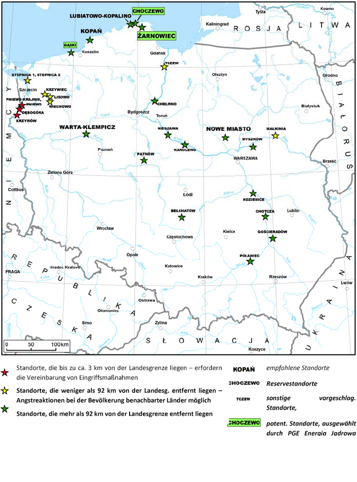 "Angstreaktionen bei der Bevölkerung benachbarter Länder möglich"Im Rahmen der grenzüberschreitenden Umweltprüfung wurden der Entwurf des polnischen Kernenergieprogramms und weitere Unterlagen auch ins Deutsche übersetzt und auf den Internetseiten des Bundesumweltministeriums veröffentlicht. Die untenstehende Karte entstammt dem aktuellsten Papier, das als "Nachtrag zur Umweltverträglichkeitsstudie des polnischen Kernenergieprogramms" im Januar dem Bundesumweltministerium übermittelt wurde. In grüner Schrift sind die drei favorisierten Standorte für den Bau des ersten polnischen Kernkraftwerks bezeichnet (Zarnowiec, Choczewo, Gaski). Rote Sterne markieren vorgeschlagene KKW-Standorte, die direkt an der Grenze zu Deutschland liegen und deshalb die "Vereinbarung von Eingriffsmaßnahmen" erfordern würden (Debogora, Krzymow, Pniewo und Pniewo-Krajnik). Gelbe Sterne stehen für Standorte, bei denen nach Ansicht der polnischen Regierung zumindest "Angstreaktionen bei der Bevölkerung benachbarter Länder möglich" wären. Grüne Sterne markieren Standorte, die mehr als 92 Kilometer von den Grenzen mit Deutschland, Tschechien, der Slowakei, Weißrußland, Litauen und dem russischen Teil des früheren Ostpreußen entfernt sind.
