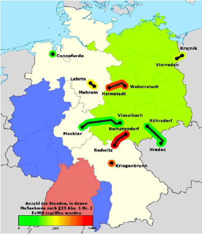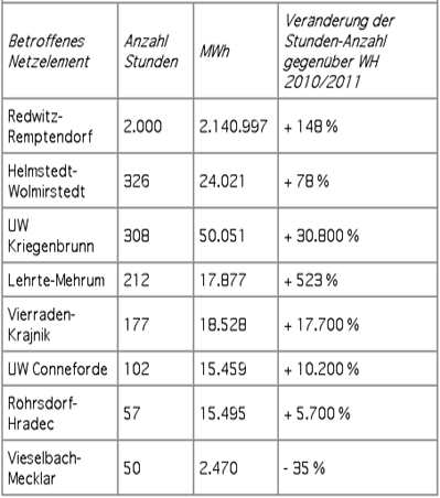 Vervielfacht haben sich auch die unterhalb dieser Schwelle liegenden Interventionen, die zur Abwendung von Netzstörungen "netzbezogene Maßnahmen" wie Netzschaltungen oder "marktbezogene Maßnahmen" wie den Einsatz von Regelenergie vorsehen. So erhöhte sich die Anzahl der Stunden, in denen auf den am stärksten betroffenen Netzelementen im deutschen Übertragungsnetz sogenannte Redispatch-Maßnahmen erforderlich wurden, bis auf mehr als das Dreißigfache (siehe nebenstehende Grafik/Tabelle). Auf der stark belasteten Trasse zwischen Remptendorf (Thüringen) und Redwitz (Bayern) verzwanzigfachte sich das Volumen der Redispatchmaßnahmen von 100.150 MWh auf 2.140.997 MWh. Als "Redispatch"bezeichnet man Eingriffe der Übertragungsnetzbetreiber in die marktbasierten Fahrpläne der Kraftwerksbetreiber, die notwendig sind, um Leitungsüberlastungen zu verhindern bzw. zu beseitigen.