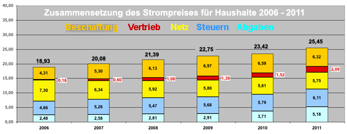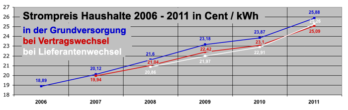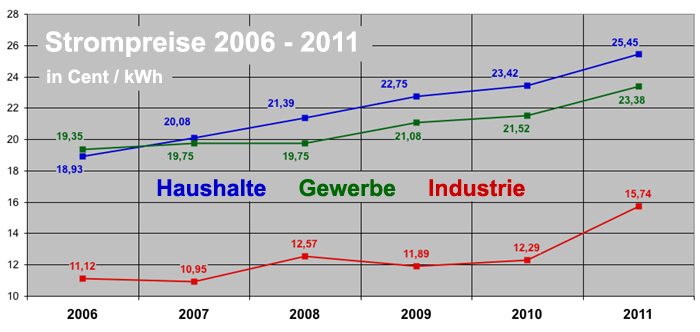 Beide Faktoren zusammen ergaben von 2006 bis 2011 ein Strompreisanstieg