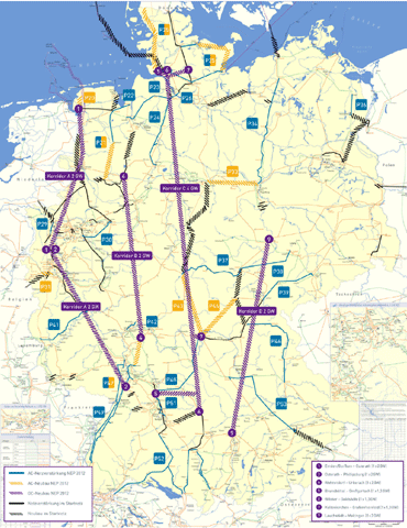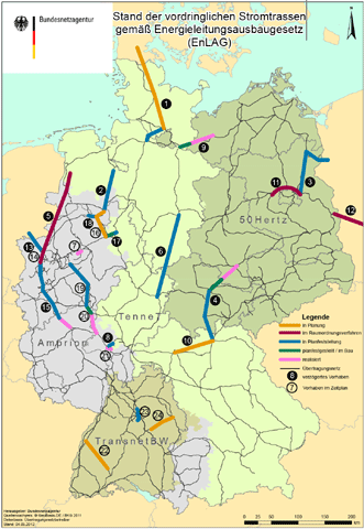 Die vier Übertragungsnetzbetreiber haben am 30. Mai zum ersten Mal den "Netzentwicklungsplan" veröffentlicht, den sie gemäß § 12b des neugefaßten Energiewirtschaftsgesetzes (EnWG) bis zum 3. Juni 2012 und anschließend jeweils jährlich bis zum 3. März der Bundesnetzagentur vorzulegen haben. Der Entwurf wird bis 10. Juli unter www.netzentwicklungsplan.de öffentlich zur Konsultation gestellt. Danach soll er in der zweiten Augusthälfte in überarbeiteter Fassung der Bundesnetzagentur übergeben werden. Diese hat ihn dann zu bestätigen (§ 12c) und der Bundesregierung als Grundlage für deren "Bundesbedarfsplan" zu übermitteln (§ 12e).