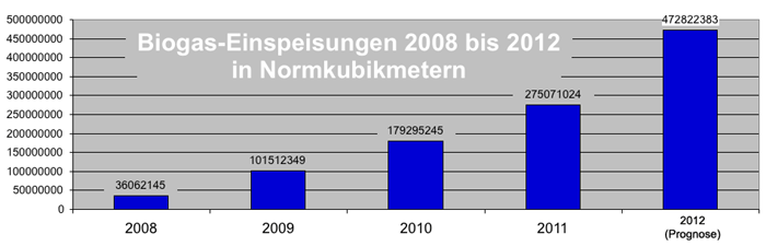Zum Jahresende 2011 gab es in Deutschland 77 Biogasanlagen, die insgesamt 275 Millionen Kubikmeter in das Gasversorgungsnetz einspeisten. Für das laufende Jahr prognostizieren die Netzbetreiber eine weitere Zunahme der Biogas-Einspeisung um etwa siebzig Prozent auf rund 273 Millionen Normkubikmeter (siehe Grafik). Dennoch wird das in § 31 der Gasnetzzugangsverordnung (GasNZV ) formulierte Ziel wohl kaum erreicht werden, die Einspeisung bis 2020 auf sechs Milliarden und bis 2030 auf zehn Milliarden Kubikmeter zu steigern. Bis 2011 wurden diese Ziele erst zu 4,58 bzw. 2,75 Prozent erreicht. Dies ergibt sich aus dem Biogas-Bericht, den die Bundesnetzagentur gemäß § 37 GasNZV jährlich zu erstellen hat und den sie am 11. Juni zum zweiten Mal vorlegte.
