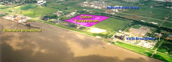 Neben dem stillgelegten Kernkraftwerk Brunsbüttel (rechts) hatte die Südweststrom die Option für ein Kraftwerksgelände erworben, auf dem zwei Steinkohle-Blöcke mit insgesamt1800 MW errichtet werden sollten. Links von diesem Gelände und im dahinterliegenden Industriepark Bayer planten GDF Suez und GETEC zwei weitere Blöcke mit 800 MW. Nun haben sich alle drei Kraftwerksvorhaben zerschlagen. Foto: Südweststrom/egeb