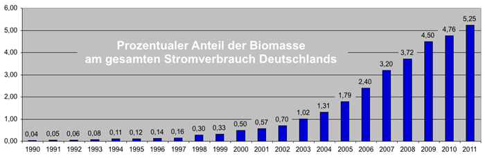 Der Anteil der Biomasse an der gesamten deutschen Stromerzeugung hat sich durch die EEG-Förderung binnen zehn Jahren bis 2011 fast verzehnfacht. Bei Beachtung des Gebots der Nachhaltigkeit ist er aber nur sehr bedingt weiter vermehrbar. Quelle: BMWi/Energie-Daten