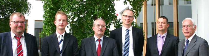 Der Regensburger Staatsrechtler Gerrit Manssen (links) hält die EEG-Umlage wegen des seit 2010 grundlegend veränderten "Ausgleichsmechanismus" für verfassungswidrig. Auf sein Gutachten stützen Andreas Munding und Dieter Dörrmann (Spinnweberei Uhingen), Bernd Drechsel (Textilveredlung Drechsel) sowie Gregor Götz (Vowalon) ihre Forderung nach Rückzahlung der EEG-Umlage. Unterstützt werden sie dabei vom Gesamtverband der Textil- und Modeindustrie, der bei der Pressekonferenz in Berlin durch Hauptgeschäftsführer Wolf-Rüdiger Baumann vertreten wurde (v.l.n.r). Foto: t+m.