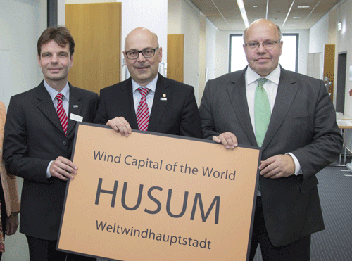 Wie lange noch? – Zur Eröffnung der diesjährigen Windmesse am 18. September präsentierte Bundesumweltminister Peter Altmaier gemeinsam mit dem schleswig-holsteinischen Ministerpräsidenten Torsten Albig und Messechef Peter Becker (v.r.n.l.) ein Schild, das Husum zur "Weltwindhauptstadt" erklärt. Foto: Thomas Köhler / photothek.net/BMU