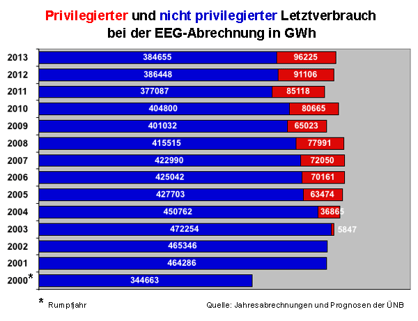 | Die "marktwirtschaftliche" Deformierung des EEG begann 2003, als man immer mehr Großverbraucher von der Umlage weitgehend befreite und dadurch die Belastung der "nicht privilegierten Letztverbraucher" entsprechend erhöhte. |
