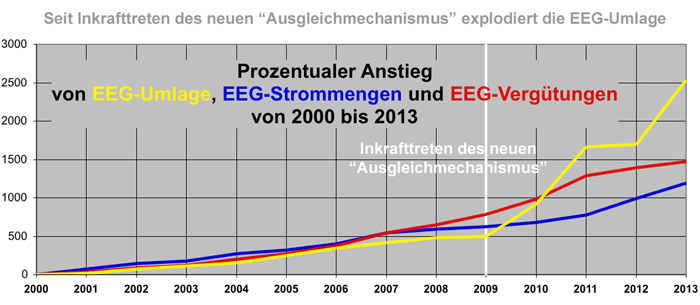 | Die verhängnisvollen Auswirkungen des neuen Ausgleichsmechanismus und anderer Maßnahmen zur "marktwirtschaftlichen" Umgestaltung des EEG veranschaulicht diese Grafik, die den prozentualen Anstieg der drei wichtigsten Parameter vergleicht. |