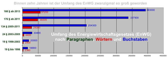 | Der immense Regulierungs- und Bürokratieaufwand, den die sogenannte Liberalisierung des Energiemarktes erfordert, hat unter anderem zu einer enormen Aufblähung des Energiewirtschaftsgesetzes geführt: In der neuesten Fassung, die jetzt im November beschlossen wurde, hat das EnWG den zwanzigfachen Textumfang wie zu Beginn der Liberalisierung. Die Zahl der Paragraphen hat sich dagegen "nur" verzehnfacht. Der Textumfang pro Paragraph hat sich also im Schnitt verdoppelt. Ähnlich sieht es bei anderen energiewirtschaftlichen Gesetzestexten wie dem EEG aus. Hinzu kommt eine Flut von Rechtsverordnungen und behördlichen Ausführungsvorschriften, die niemand mehr in ihrer Gesamtheit überblickt. |