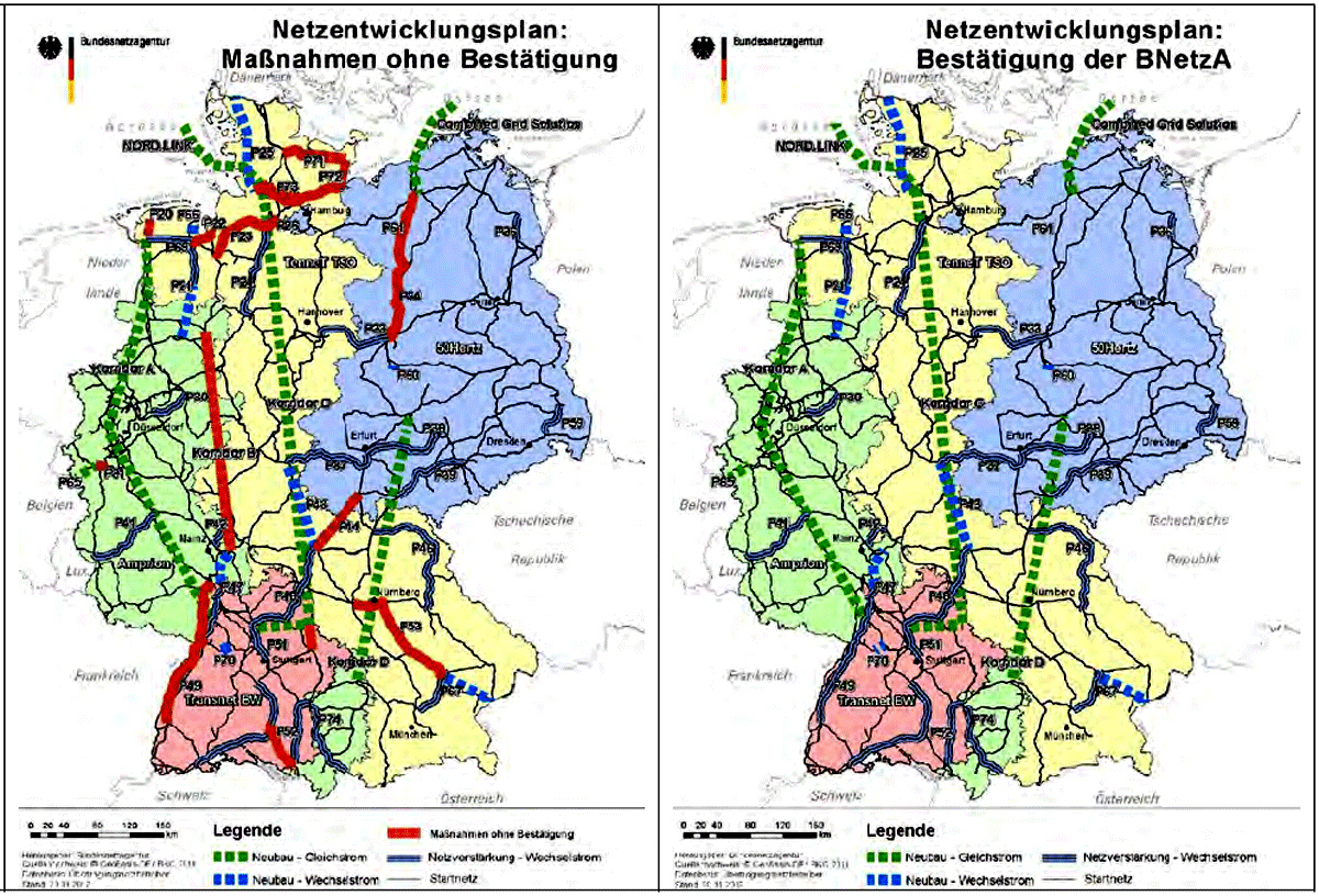 Die rötlich markierten Aus- und Neubauvorhaben in der Grafik links werden vorläufig nicht in den Bundesbedarfsplan aufgenommen. Die Grafik rechts zeigt die verbliebenen HGÜ-Korridore (grün) sowie die im Drehstrom-Übertragungsnetz geplanten Neubautrassen (hellblau) und Netzverstärkungen (dunkelblau). Die farbigen Flächen kennzeichnen die Gebiete der vier Übertragungsnetzbetreiber TenneT TSO (gelb), Amprion (grün), 50Hertz Transmission (blau) und TransnetBW (rosa), die inzwischen an die Stelle der früheren Regelzonenbetreiber E.ON, RWE, Vattenfall und EnBW getreten sind . |