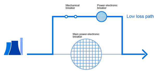 Diese ABB-Darstellung verdeutlicht, wie der HGÜ-Strom normalerweise verlustarm am elektronischen Hauptschalter vorbeifließt. Bei einem Kurzschluß wird er aber dank eines sehr schnellen mechanischen Schalters über den elektronischen Leistungsschalter geführt und binnen fünf Mikrosekunden unterbrochen. |