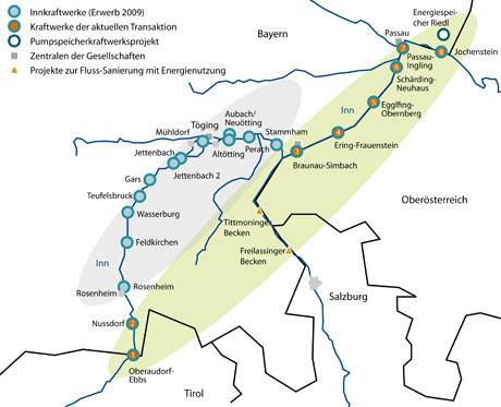 Das Wasserkraftwerk Nußdorf (links) ist eines der acht Laufwasserkraftwerke, die Österreichs Verbund jetzt von E.ON übernimmt (grüne Zone). Mit Ausnahme des Grenzkraftwerks Jochenstein an der Donau liegen alle am Inn. Schon 2009 hat E.ON dem Verbund ein Dutzend Wasserkraftwerke am Inn überlassen (graue Zone). Der österreichische Konzern verfügt damit künftig auf deutschem Gebiet über sämtliche Kapazitäten an diesem wasserreichen Fluß. Foto: E.ON /Grafik: Verbund |