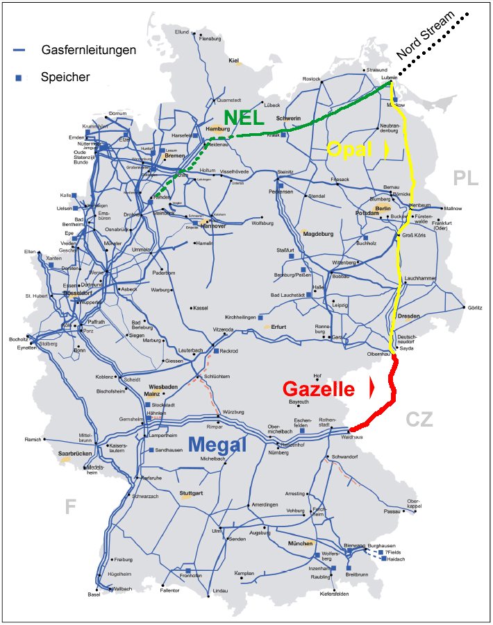 Beide Entscheidungen muten ziemlich willkürlich an. Im Grunde nehmen sie das formale Kriterium einer grenzüberschreitenden Verbindung nur zum Vorwand, um die Befreiung von der Regulierung, die aus anderen Gründen opportun erscheint, begründen zu können. Faktisch hat die "Gazelle" mit der tschechischen Gasversorgung überhaupt nichts zu tun. Sie ist nur eine Art Bypass zur Entlastung bereits vorhandener Leitungen (siehe Karte 2). Auch ohne sie wäre die "Opal" mit dem Transportnetz der Net4Gas verbunden. Eine ersatzweise Versorgung Tschechiens aus der Ostsee-Pipeline wäre deshalb in jedem Falle möglich, falls der Gastransit durch die Ukraine verringert oder unterbrochen würde, wie dies vor vier Jahren geschah (090101). Für mehr Wettbewerb sorgen beide Projekte auch nicht, weil der Lieferant in allen Fällen Gazprom ist und ihre Befreiung von der Regulierung die faktische Marktmacht der beteiligten West-Unternehmen Wintershall, E.ON, RWE, Gasunie und Fluxys sicherlich noch verstärkt. Faktisch handelt es sich bei "Opal" und "Gazelle" nicht um zwei grenzüberschreitende Leitungen, sondern um eine einzige Kombi-Pipeline, die den Anlandepunkt des aus Rußland kommenden Erdgases von der Ostsee nach Bayern verschiebt (siehe Karte 1).
