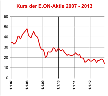 Den Anti-Korruptionsbeauftragten Wickler erstaunt, daß die nicht an der Börse gehandelte Aktie der E.ON Thüringer Energie AG im aktuellen Wertgutachten um ein Drittel höher als 2008 bewertet wird, obwohl sich die Börsennotierung der Konzernmutter im selben Zeitraum halbiert hat. |