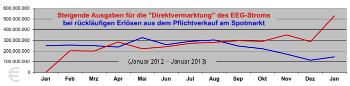 Die neu eingeführte "Marktprämie" schlug auf dem EEG-Konto erstmals im Februar 2012 mit 203,35 Millionen Euro zu Buche. Bis Januar 2013 kletterte sie auf 530,75 Millionen Euro. Zugleich sanken auf der Einnahmen-Seite die Erlöse aus dem Pflichtverkauf des EEG-Stroms an der Börse von 255 auf 146 Millionen Euro. Zum Jahresende 2012 rutschte das EEG-Konto so tief in die roten Zahlen wie noch nie zuvor. Hauptursache war aber nicht die EEG-Förderung an sich, sondern deren sukzessive "marktwirtschaftliche" Deformierung, die mit dem seit 2012 praktizierten Subventionsmodell "Direktvermarktung" eine neue Stufe erreichte. |