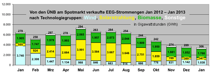 Als Folge der neu eingeführten Direktvermarktung haben die vier Übertragungsnetzbetreiber im Januar 2013 über vierzig Prozent weniger EEG-Strom an der Börse verkauft als im Vergleichsmonat des Vorjahres. Nebenbei läßt diese Grafik das im Jahresverlauf stark schwankende Aufkommen an Solarstrom erkennen. |