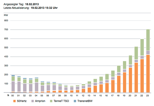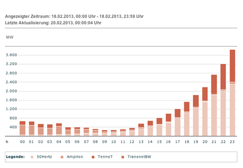 Dabei hat sich die Höhe der gezahlten Einspeisungsvergütungen kaum verändert. Die jetzt von den Übertragungsnetzbetreibern veröffentlichten vorläufigen Zahlen weisen für 2012 insgesamt 16.621.170.295,30 Euro an Vergütungszahlungen aus. Das sind gerade mal 1,54 Prozent mehr als die in der Jahresrechnung 2011 genannten 16.369.030.162,63 Euro. Diese scheinbare Stagnation bei den Einspeisungsvergütungen trügt jedoch, da die "Marktprämie", die erstmals im Februar 2012 auf dem EEG-Konto zu Buche schlug, nichts anderes als eine umgewidmete Form der Einspeisungsvergütung ist und sich bis Ende Dezember auf 2,9 Milliarden Euro addierte. Im Januar 2013 beliefen sich die Ausgaben für die Marktprämie sogar auf 531 Millionen Euro. Das ist gut das Doppelte des monatlichen Durchschnittswerts im Jahr 2012.