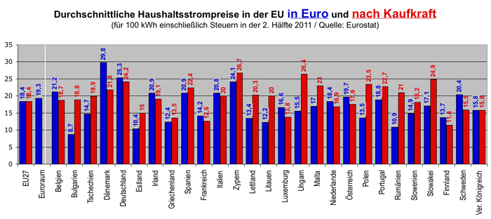 Im Vergleich mit Deutschland zahlten die Bulgaren 2011 gerade mal ein Drittel des Endpreises für Haushaltsstrom (blaue Balken). Etwas anders sieht es aus, wenn man den von Eurostat errechneten Kaufkraftstandard (KKS) berücksichtigt (rote Balken). Aber auch der KKS bringt offenbar die reale Belastung der bitterarmen Bevölkerung Bulgariens durch die Strompreise nur sehr unzureichend zum Ausdruck. Die Grafik läßt außerdem wieder mal erkennen, daß die deutschen Haushaltsstrompreise nur von denen in Dänemark übertroffen werden. Dennoch dürften andere Länder noch härter betroffen sein, wenn man die reale Kaufkraft und den Stellenwert der Stromrechnung im Haushaltsbudget berücksichtigt. Zumindest Ungarn, die Slowakei und Zypern erreichen einen höheren KKS-Wert als Deutschland, und auch für Polen und Portugiesen dürfte die Belastung noch erheblich größer sein als in Deutschland. |