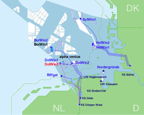 | Mit DolWin3 (rot markiert) kommt bei der Netzanbindung von Windparks