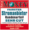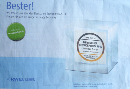 Bei der Verleihung des "Deutschen Servicepreises 2013" fungierte der Fernsehsender n-tv als Medienpartner. In der "Kategorie Energie" erhielten dabei neben RWE auch "Lekker Energie" und "Lichtblick" einen Platz auf dem dreistufigen Siegertreppchen. Die beiden Zweit- und Drittplazierten scheinen aber eine Werbung mit dem "Testsiegel" nicht für sinnvoll erachtet zu haben. Stattdessen wirbt "Lekker Energie" auf seiner Internet-Seite mit dem Prädikat "Fairster Stromanbieter", das von der Zeitschrift "Focus Money" verliehen wurde. Man darf vermuten, daß der diesbezügliche Test der "26 größten Stromanbieter in Deutschland" ebenfalls von DISQ durchgeführt wurde. Das "Kundenurteil sehr gut", mit dem sich "Lekker Energie" schmückt, bekamen dabei noch sechs weitere Anbieter.